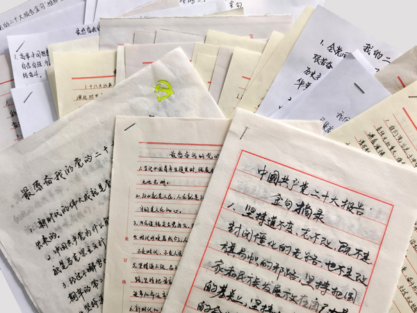 通知一经下发,虽处疫情居家办公期间,但大家的积极性丝毫不受影响。公司领导班子成员率先垂范,结合参加国务院国资委培训中心学习贯彻党的二十大精神网络培训班学习收获,原原本本学习党的二十大报告原文,共推荐金句112条。党员职工认真学习党的二十大报告,深刻理解报告中的新论断、新要求、新部署,怀着崇敬的心情,一字一句工整地抄写着金句,并表示,作为国企职工,要深入学习贯彻党的二十大精神,立足本职、积极工作。十分公司王帅表示,通过摘抄党的二十大报告金句,又是一次原原本本学习,通过抄写,对报告内容又有新理解、新收获,中国共产党为人民谋幸福,从来都是动真情、出实招、办实事。“作为一名党员,要当好干事先锋员,以奋发有为的姿态抓工作落实。对照党的二十大的法治要求,响应党的二十大的号召,我们要做社会主义法治的自觉遵守者、坚定捍卫者。”六分公司刘生说。五分公司丁江霞更是在认真抄写党的二十大报告原文的同时,把自己朗诵的党的二十大报告金句录制下来,发送到自己的社交平台,让更多的人投身到党的二十大报告学习中来。